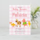 Um teste padrão cor-de-rosa do guingão é o fundo para é convite do chá do bebé do animal de fazenda. As cores pastel cor-de-rosa macias com bonito poucos animais de fazenda com fazem a este convite esse de um tipo.