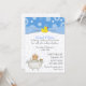 Convite bonito do chá do bebé, feito em azul e em branco, com bolinhas e gráficos de um arco azul pálido grande, com um ducky de borracha decorando o meio. Trabalhos de arte adoráveis do país de um bebê em uma banheira à esquerda o lado de inferior esquerdo. Personalize o texto para serir suas necessidades do partido de chá.