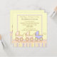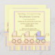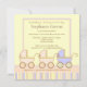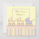 Três vezes o divertimento! Aquele é o anúncio neste convite do chá de fraldas que de bebê cor-de-rosa das características as carruagems e azul adoráveis com cor-de-rosa, azul, amarelam, e tan listras em um fundo amarelo.