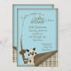 Nosso convite do chá do pescador do bebê tem um filhote de cachorro comer uma parte fora do papel com uma lata de sem-fins e um pólo de pesca ao lado dele. As cores são azul da cerceta com xadrez no marrom, tan e azul.
