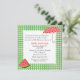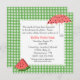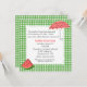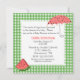 Convite quadrado doce do chá de fraldas feito em um teste padrão verde e branco do guingão, com uma área de texto branca scalloped quadrado da borda, no meio. Os gráficos coloridos de uma fatia da melancia, decoram o canto de inferior esquerdo do convite e um guarda-chuva feito em cores da melancia decora o canto direito superior. Personalize texto feito sob encomenda do rosa preto e salmon para serir suas necessidades do chá. Convite que bonito a mamã a ser amará e aperfeiçoará para um chá de fraldas das horas de verão.