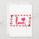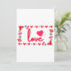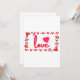 Este convite apresenta a palavra “Amor” em uma fonte de impressão única com letras vermelhas e contorno rosa dentro de um design de estilo retangular com corações temáticos vermelhos e rosas, rosas e coração em estilo de morango em dois cantos neste tema do Dia dos Namorados. Impresso em um papel clássico, completo, com 17,5 pt de espessura e acabamento matte não revestido com textura de casca de ovo feito e impresso nos EUA com "Amor" impresso no verso.