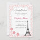 Convite do doce dezesseis com tema de Paris e fundo cor-de-rosa.