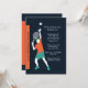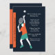 Um convite do esporte-tema para o aniversário de um entusiasta do tênis. O cartão caracteriza um jogador de ténis masculino aproximadamente para servir a bola. A laranja corajosa, a cerceta e as cores brancas saltam contra o fundo preto.
