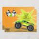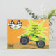 Este convite do monster truck é certo ao wow todos seus convidados convidados. As cores brilhantes da laranja e do verde são emparelhadas com os marrons da natureza e as bandeiras preto e branco da raça do verificador. O caminhão é verde com laranja amarelar o detalhe da chama. O cartão é fácil de personalizar com seus fraseio, pia batismal, cor da pia batismal e escolha de seis tipos de papel.