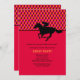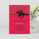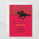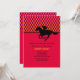Um convite esportivo perfeito para uma festa do Kentucky Derby ou qualquer ocasião relacionada a corridas de cavalos. O cartão apresenta um padrão de árgula vermelho, laranja e preto no topo, um fundo vermelho sólido e um jóquei de silhueta sobre um cavalo em preto.O convite é fácil de personalizar com seu texto, fonte, cor da fonte e escolha de seis tipos de papel.