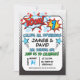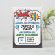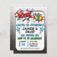 O convite do primeiro aniversario do super-herói dos gêmeos deste menino caracteriza um grande número, desenhos animados como palavras e elementos em um fundo branco e preto. Eu quis criar especialmente convites do super-herói de algum menino novo para um primeiro aniversario porque eu não tenho alguns na loja neste momento. A versão similar deste design com uma fotografia está igualmente disponível na loja. O convite do super-herói do primeiro aniversario dos gêmeos deste menino está pronto para ser personalizado.