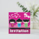 Convite bonito, seus amigos vão adorar! 3 bonecas japonesas kawaii (kokeshi) em fundo rosa com flores de cereja.