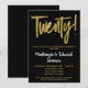 Um convite de festa de aniversário de casamento de 20 anos preto e dourado, elegante, simples mas impressionante. Texto com letra glamorosa no topo e texto dourado abaixo com o nome em branco que se destaca