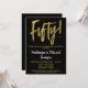 Um convite de festa de aniversário de casamento de 50 anos preto e dourado, elegante, simples mas impressionante. Texto com letra script glamorosa no topo e texto dourado abaixo com o nome em branco destacado