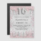 Um moderno, na moda e glamouroso ímã de convite para uma festa de aniversário Doce 16, 16. Um fundo de aspecto fino prateado, decorado com pó brilhante de prata rosa e falso. Personalize e adicione o seu nome e detalhes da festa. O número 16 é escrito com uma fonte de estilo de balão, script.