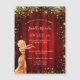 Um moderno, na moda e glamouroso ímã de convite para uma doce festa de aniversário 16, 16, tema Hollywood. Um fundo vermelho com pó de ouro falso, uma garota vestindo um vestido de ouro. Uma cortina de filme vermelha como fundo O nome é escrito com um moderno script de estilo escrito à mão. Personalize e adicione os detalhes da sua festa.