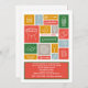 Um design alegre que caracteriza ícones do CHURRASCO da comida, dos utensílios e do equipamento em umas caixas vermelhas, verdes, do ouro e das cinzas. Aperfeiçoe para seu assado seguinte. (FP)