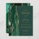 A borda esquerda deste elegante convite de casamento moderno apresenta uma esmeralda verde aquarela agate borda com falsa brilho dourado. O texto personalizável combina manuscrito dourado, copperplate e fontes itálicas em um fundo verde esmeralda. O verso apresenta um design emerald verde e dourado.