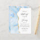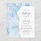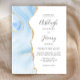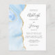 A borda esquerda deste elegante convite de casamento moderno apresenta uma cor azul-d-água pastel, cor azul-d-água, aparada com falso brilho dourado. O texto personalizável combina manuscrito, copperplate e fontes itálicas em cinzas de carvão em um fundo branco. O verso apresenta um design de agate dourado e azul-bebê correspondente.