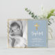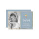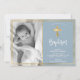 Simples Elegante Dourado batizante de batismo Azul e batismo Foto Convite. Enviar para a família e amigos com esta carta religiosa moderna personalizada. Ele apresenta um roteiro com letra de "Batismo", em torno de uma estrutura dupla falsa de folha de ouro sobre fundo azul leve e empoeirado.