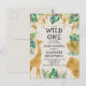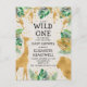 Este convite para chás de fraldas, chamado "selvagem", contém folhas falsas de ouro (girafa, leão e macacos), folhagem dourada e selva verde, e uma aspersão de confete de ouro sobre fundo de nóvoa. Adicione o nome da futura mãe e os detalhes do chá em texto preto.