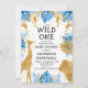 Este convite de chá de fraldas "selvagem" de safari da selva com o tema "garoto" apresenta folhas falsas de ouro (girafa, leão e macacos), folhagem dourada e da selva azul, e uma aspersão de confete de ouro sobre fundo branco. Adicione o nome da futura mãe e os detalhes do chá em texto preto. Um padrão de estrutura foliar da selva em azul e ouro em um fundo branco decora a parte traseira da placa.