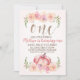 Convite cor-de-rosa doce floral e do falso de ouro da folha primeiro do aniversário para a menina que caracteriza uma abóbora e uns arranjos florais cor-de-rosa. A palavra uma está em uma textura cor-de-rosa da folha de ouro do falso. Este design é uma maneira doce a convida convidados ao seu pequeno sua primeira festa de aniversário.