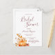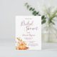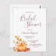 Na frente: Um convite de Chá de Panela moderno, elegante e simples para o outono. Um fundo branco. Decorado com uma abóbora dourada, folhagens e algumas flores brancas. Modelos para o nome da noiva, data e local do chá. O texto: Chá de Panela está escrito com um estilo de letra manuscrita grande, letras em cor de rosa escuro dourado.