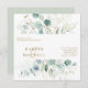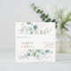 Este convite de casamento quadrado apresenta cor d'água eucalipto, verde botânico e folhas douradas com guião dourado.