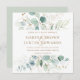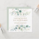 Este convite de casamento quadrado apresenta cor d'água eucalipto, verde botânico e folhas douradas com guião dourado.