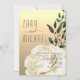 Um convite de casamento botânico, moderno, elegante, elegante, com uma adorável flor de rosa branca, verde e um roteiro de caligrafia moderno.