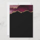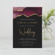 Este convite de casamento da moda apresenta uma imagem de aquarela de um geode agado em tons de vermelho burgundy, aparado com falsos realces de ouro. A palavra "Casamento" aparece em falsa brilho dourado em letra decorativa moderna de escrita manual. Personalize-o com os nomes dos casais em texto dourado e os detalhes do casamento em sans serif branco em um fundo preto. A mesma imagem de burgundy agate aparece no verso.