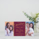 Duas fotos de colagem elegante Burgundy e convite para casamento de ouro. Texto clássico da caligrafia elegante que diz "Casamento". Seu texto personalizado é mostrado em fontes de na moda complementares. O design apresenta 2 fotografias de noivado de cor que pode mudar para as suas próprias fotografias de noivado. Zazzle tem todos os tipos de recursos de "adicionar sua própria foto" e design de "fazer você mesmo". As únicas partes deste design que não podem ser personalizadas são a palavra "casamento" (embora você possa removê-lo ou movê-lo em volta) e o fundo da burlagem. Um convite para casamento elegante a um preço muito barato.