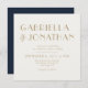 Uma elegante procura minimalista pelos seus convites de casamento. Esta frente do cartão é creme com uma tipografia de ouro moderna. Personalize com seus detalhes importantes, incluindo seus nomes, data do casamento e local. O verso é um marinho azul rico com suas iniciais em ouro