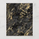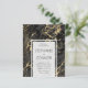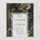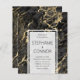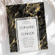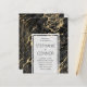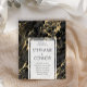 Estes elegantes convites de casamento apresentam um fundo de mármore preto e dourado. O texto aparece em fontes simples e modernas de sans negras serif em um retângulo branco semitransparente alinhado com a parte inferior da placa. O design de mármore também aparece no verso.