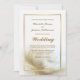 Um convite para o casamento de uma pena de ouro elegante. Uma solicitação de RSVP foi incluída na parte inferior deste convite como um lembrete para seus convidados confirmarem sua presença.