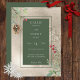 Esta design apresenta simples tochas de pínus com pinheiros cones e morangos vermelhos em cantos opostos. O centro é um belo verde macio e escuro, com texto branco, sobre um fundo brilhante de ouro champanhe. Uma escolha perfeita para um Natal ou casamento no inverno. Bonito e elegante, este cartão faz parte do Suite Moderno de Casamento de Pinus Berries, de inverno, criado pela imprensa simplesmente de farmácia.