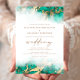 Este elegante convite de casamento apresenta um design de borda verde-lacrimejante em imitação de mármore veinado com folha de ouro falsa, desaparecendo gradualmente no fundo branco. A palavra "casamento" aparece em escrita manuscrita dourada, com o texto remanescente em maiúsculas de serifa douradas. O padrão de mármore de ouro e touro é repetido na parte traseira do cartão.