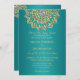 Para aquele casamento clássico, elegante ao estilo indiano, estes cartões de modelo de convite à água azul, verde e dourado são fáceis de editar. Uma bela flor de medalhão exótica em ouro e diamante no meio dá a essas cartas um toque extra de elegância. A parte de trás da carta tem monogramas de noiva e noivo. Entre em contato com o designer para obter mais variações. A cor de fundo pode ser alterada a pedido. Perfeito para casamentos no leste asiático, indonésio, marroquino.
