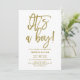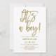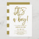 Convite de chá de fraldas personalizável com script dourado com letra manuscrita com padrão de listras. Moderno e único, perfeito para qualquer tema de chá de fraldas. Este convite de chá de fraldas "É um Menino" está disponível em outras cores.