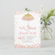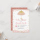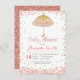 Um convite para chá de fraldas de guarda-chuva Dourado cor-de-rosa com belos florais dourados e confete dourado.