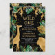 Este convite para chás de fraldas, chamado "selvagem", contém folhas falsas de ouro (girafa, leão e macacos), folhagem dourada e selva verde, e uma aspersão de confete de ouro sobre fundo preto. Adicione o nome da futura mãe e os detalhes do chá em texto branco e dourado. Um padrão de folhagem em verde e dourado em fundo preto decora a parte de trás da carta.