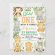 Celebre o seu primeiro aniversário com este adorável convite da selva "Wild One", com o tema safari! Apresentando animais bonitos de aquarela como macaco, elefante, tigre, girafa, zebra, leão e hipopótamo, cercados por folhas tropicais exuberantes, este convite é perfeito para uma divertida e selvagem primeira festa de aniversário. Personalize-o com o nome, data, hora e local da festa do seu filho. Ideal para a festa da selva de um menino ou de uma menina.