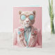Um leopardo branco na moda que veste um terno rosa extravagante enfeitado com joias, detalhes florais e elegantes embelezamentos. Os óculos de sol e uma bolacha pastel, com colagem de diamante esportivo, exudem sofisticação e glamour.