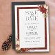 This romantic and classic Christmas or winter-themed save the date design features clusters of vibrant red and white winter flowers, pine, holly berries and rustic twigs, custom modern text graphics and editable text fields surrounded by a rich red damask border with gold edges.
