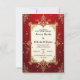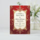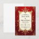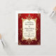 Um modelo de convite de casamento elegante e formal com um fundo vermelho ousado, adornado com padrões intricados de filigrana dourada e motivos florais sutis, apresentando uma seção retangular central branca ou creme para o texto, adornada com tipografia ornamentada em uma fonte serifada, como Bodoni ou Didot, com os detalhes do casamento escritos em uma escrita elegante e cursiva, cercada por bordas ornamentadas sutis e floreios, com um brilho ou textura sutil para dar ao convite um sentimento premium e luxuoso, colocado contra um tom vermelho profundo e rico que evoca romance e sofisticação.