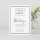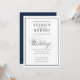 Convite de casamento clássico, preto e branco, subestimado, com um toque moderno, com a elegante escrita da palavra "Casamento" e uma fronteira azul marinho.