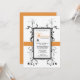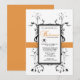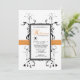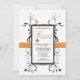 Convite de festa de fantasia de Halloween elegante com uma moldura preta ornamentada e faixa central de abóbora. A palavra "Halloween" é pré-impressa e decorada com uma aranha.