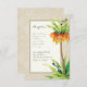 COLOR PALETTE: creme, castanho, verde, amarelo e laranja com aqua. DESIGN COLLECTION: Um cartão de convite para recepção para corresponder ao conjunto de convites para o casamento. Um bronzeado quente sobre um fundo de cor damasco pintado manualmente sutil com uma área de texto de creme suave e uma borda quente de cinza esticada. Sobreposta na design é uma ilustração botânica feita à mão, de cor aquática, uma flor elegante e sofisticada de fritillaria e um par de libélulas azul-aqua e negras. O lado inverso é a mesma cor damasco suave a ser igual. Toda esta design é feita de trabalho de arte de aquarela original por Audrey Jeanne Roberts. DESIGN PERSONALIZADO: Este convite vem em várias cores: castanho, bege cremoso, verde aqua, azul aqua e verde suave quente. Também pode ser criado sem libélulas se preferir que estejam separadas no design original.