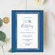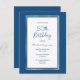 Na frente: um fundo azul clássico com uma falso quadro prateado e branco. Simples e elegante! Modelos para um nome e detalhes da festa. O nome e o texto: 50º (ou qualquer idade) Aniversário são escritos com um guião estilo manuscrito, letras azuis. Perfeito para um inverno, primavera ou festa de aniversário náutica de verão! Traseira: fundo azul clássico colorido. Dica: Se você não quiser que pareça um cartão postal, clique em personalizar, vá para o verso e remova o divisor e o carimbo de posto.