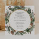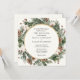 O convite para o casamento no Elegante Winter apresenta um quadro de ouro rodeado por cor d'água verde, pinheiros e flores de inverno. Personalize com suas informações ou clique em "Clique para personalizar mais" para editar estilos de fonte, tamanho e cores.