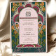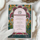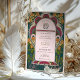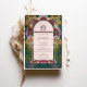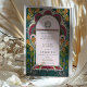 Esse convite é uma obra-prima que entrelinha o fascínio místico de uma floresta encantada com a elegância geométrica da design da Arte Deco. O verde-esmeralda rico forma um pano de fundo exuberante para o intrincado detalhamento do ouro falso. As florescências românticas em tons de rosa-pincel e marigold criam um senso de calor e capricho. O contraste entre o painel central de cor-de-rosa macio e a folhagem vibrante e florais circundantes convida os convidados para uma celebração de casamento que promete ser uma fusão luxuosa da natureza e da arte. É uma escolha perfeita para casais que procuram encanar seus convidados com o romance e a sofisticação de uma era passada reimaginada para núpcias modernas.