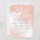 Encantando o convite para o casamento de contos de fadas com carruagems e corações com monograma de cor rosa-rosa-pincelada bonito. Design de monograma branco esmaecido com texto principal em cinzas leves.