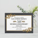 Convite Enquadrado Dourado para Bodas de Ouro 50 Anos de Casamento projetado com uma moldura preta, inserção dourada e detalhes em fita. O verso tem um fundo texturizado dourado. Para personalizar, basta inserir seus detalhes no nosso modelo fácil, substituindo o texto de exemplo. Certifique-se de ver o Banner de Festa correspondente.